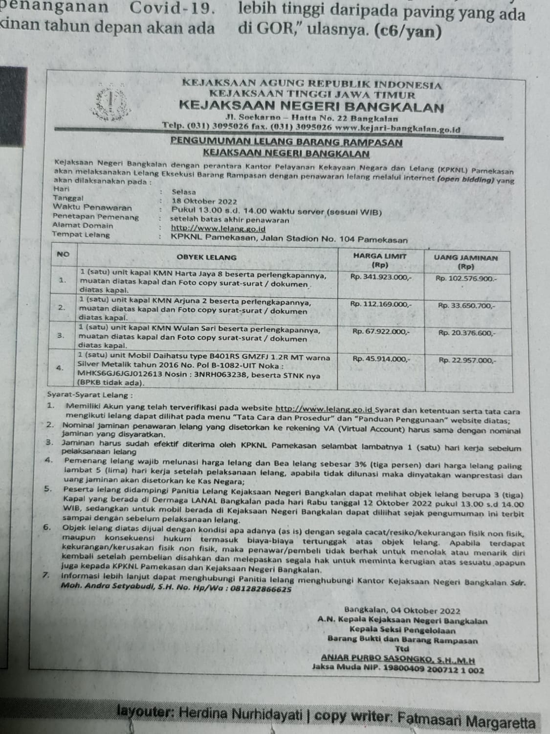 7. Informasi lebih lanjut dapat menghubungi Panitia Lelang Kantor Kejaksaan Negeri Bangkalan Moh. Andra Setyabudi, S.H Nomor WhatsApp/Telpon : 081282866625. (@red)
