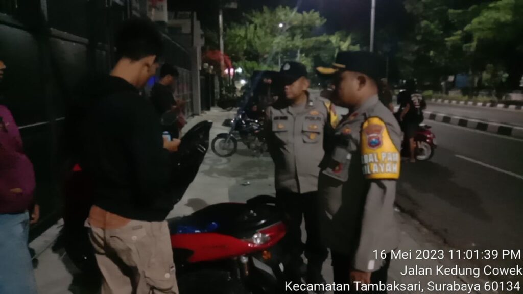 SURABAYA | Kabarmetronews.com – Sebagai bentuk mengantisipasi terjadinya aksi tindak kriminal 3C dan tawuran, kepolisian Sektor Tambaksari bersama petugas Tiga Pilar terus melakukan patroli serta pemeriksaan di malam hari. Seperti yang dilakukan di Jalan Kedung Cowek Surabaya, Selasa (16/05/2023).