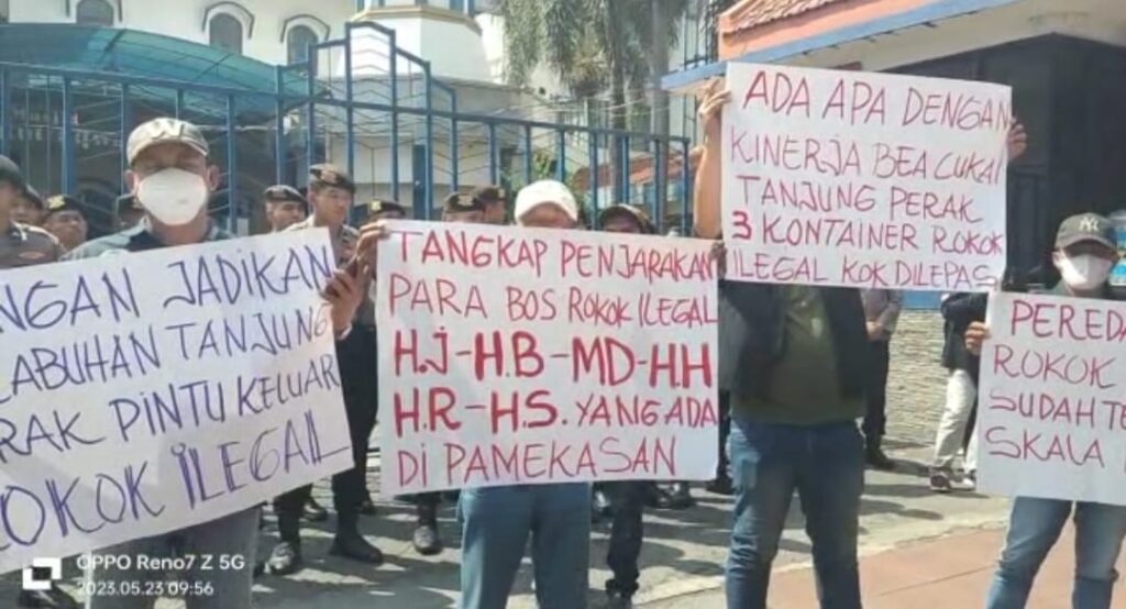 SIDOARJO | Kabarmetronews.com – Masih dalam tahapan aksi demontrasi lanjutan yang digelar oleh Aliansi Madura Indonesia (AMI) ke kantor wilayah Beacukai Jatim 1 dan kantor beacukai pelabuhan Tanjung Perak Surabaya, kini memasuki hari ke dua, hal ini lantaran untuk menyampaikan aspirasi terkait maraknya peredaran pabrik rokok ilegal yang banyak beredar di Madura dan Malang.