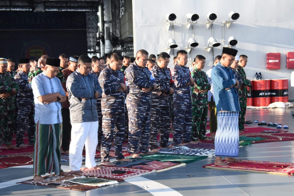 Pelaksanaan sholat Idul Adha berlangsung di Geladak Helly KRI SBY-591, selesai melaksanakan sholat Idul Adha dilanjutkan dengan halal bihalal. (@red).