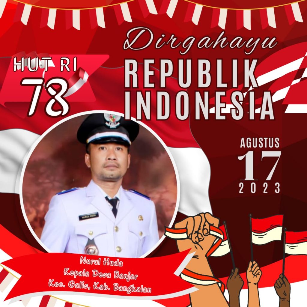 Menjelang hari Kemerdekaan Republik Indonesia yang ke- 78 pada tanggal 17 Agustus 2023 mendatang, Nurul Huda selaku Kepala Desa Banjar, Kecamatan Galis, Kabupaten Bangakalan mengucapkan selamat Dirgahayu Kemerdekaan Republik Indonesia ke- 78.