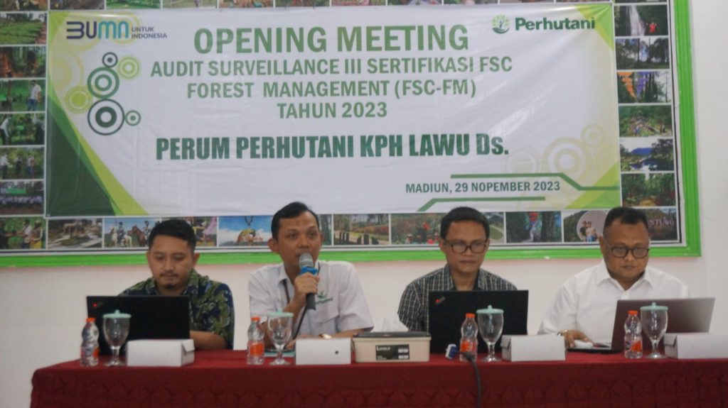 LAWU | Kabarmetronews.com – Perhutani Kesatuan Pemangkuan Hutan (KPH) Lawu Ds melakukan Opening Meeting Audit Surveillance Forest Stewarship Council (FSC) Forest Management (FM) yang dilaksanakan oleh pihak PT Standard Global Services (SGS) Qualifor Indonesia selama tiga hari, dari tanggal 29 Nopember hingga 01 Desember 2023, di Aula Gunung Lawu, Selasa (29/11).