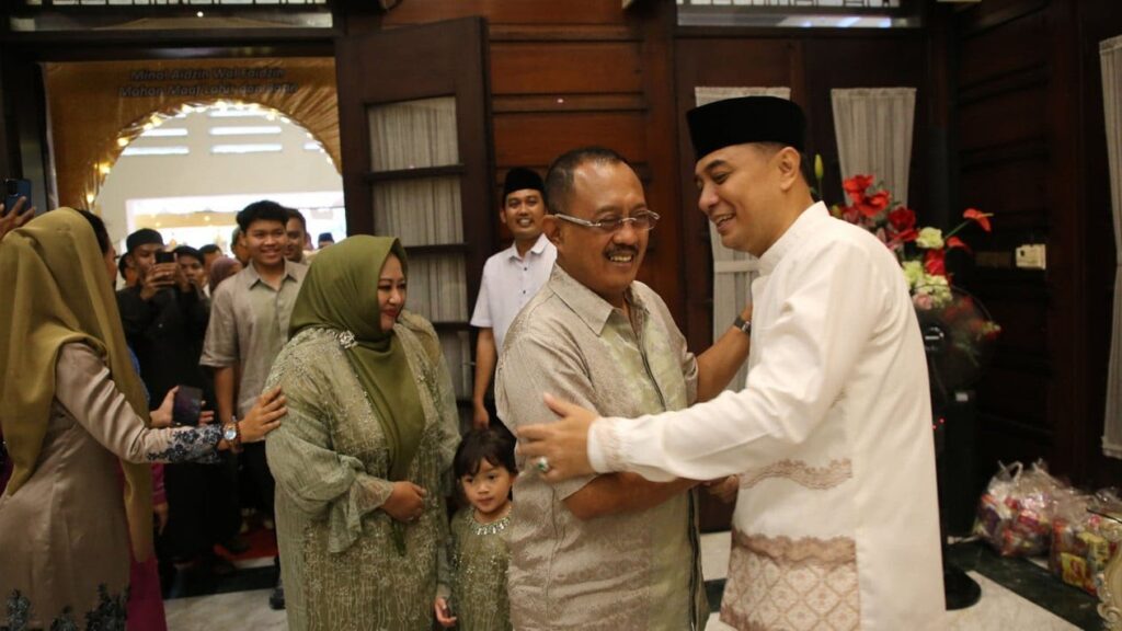 Surabaya | Kabarmetronews.com – Wali Kota Surabaya Eri Cahyadi menggelar open house usai melaksanakan Salat Idul Fitri di rumah dinas (rumdis)-nya pada Rabu kemarin. Banyak warga dari berbagai lapisan datang untuk bermaaf-maafan. Eri menyebut rumdisnya sebagai rumah masyarakat Surabaya.
