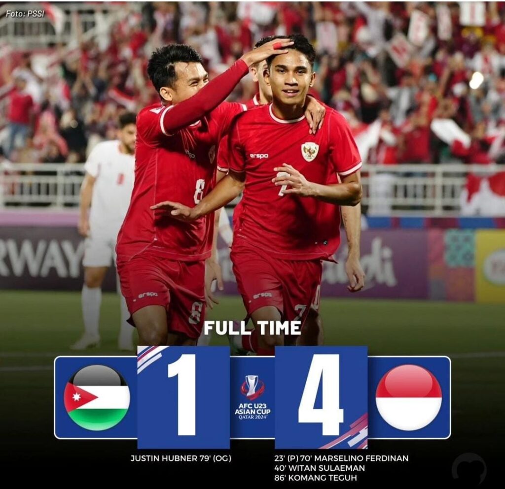 Surabaya | Kabarmetronews.com – Indonesia U-23 memastikan diri melangkah ke babak 8 besar Piala Asia U-23 2024 usai mengalahkan Yordania U-23 dengan skor 4-1. Dua gol tambahan Indonesia dicetak oleh Marselino Ferdinan menit ke-70 dan Komang Teguh menit ke-86, sedangkan gol Yordania dicetak oleh gol bunuh diri Justin Hubner.