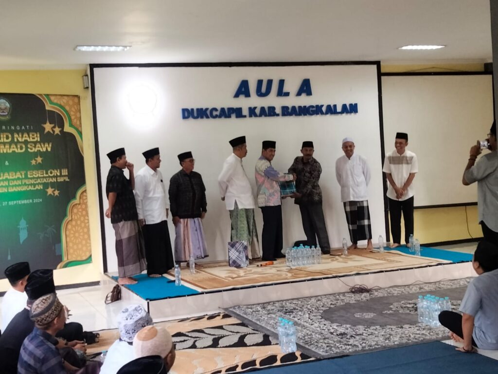 Acara peringatan Maulid Nabi Muhammad SAW berlangsung khidmat dengan pembacaan sholawat nabi dan doa bersama kemudian dilanjutkan dengan pemberian cinderamata dalam rangkaian acara pisah sambut Sertijab Pejabat Eselon III dilingkungan Dinas Kependudukan dan pencatatan sipil Kabupaten Bangkalan.