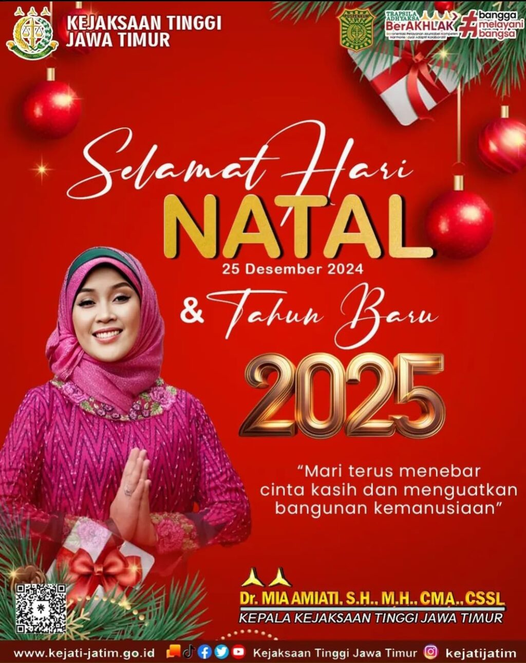Dalam peringatan Hari Natal di tahun 2024, Kajati Jatim Dr. Mia Amiati S.H., M.H., CMA., CSSL., memberi pesan damai Natal bagi umat Kristiani.