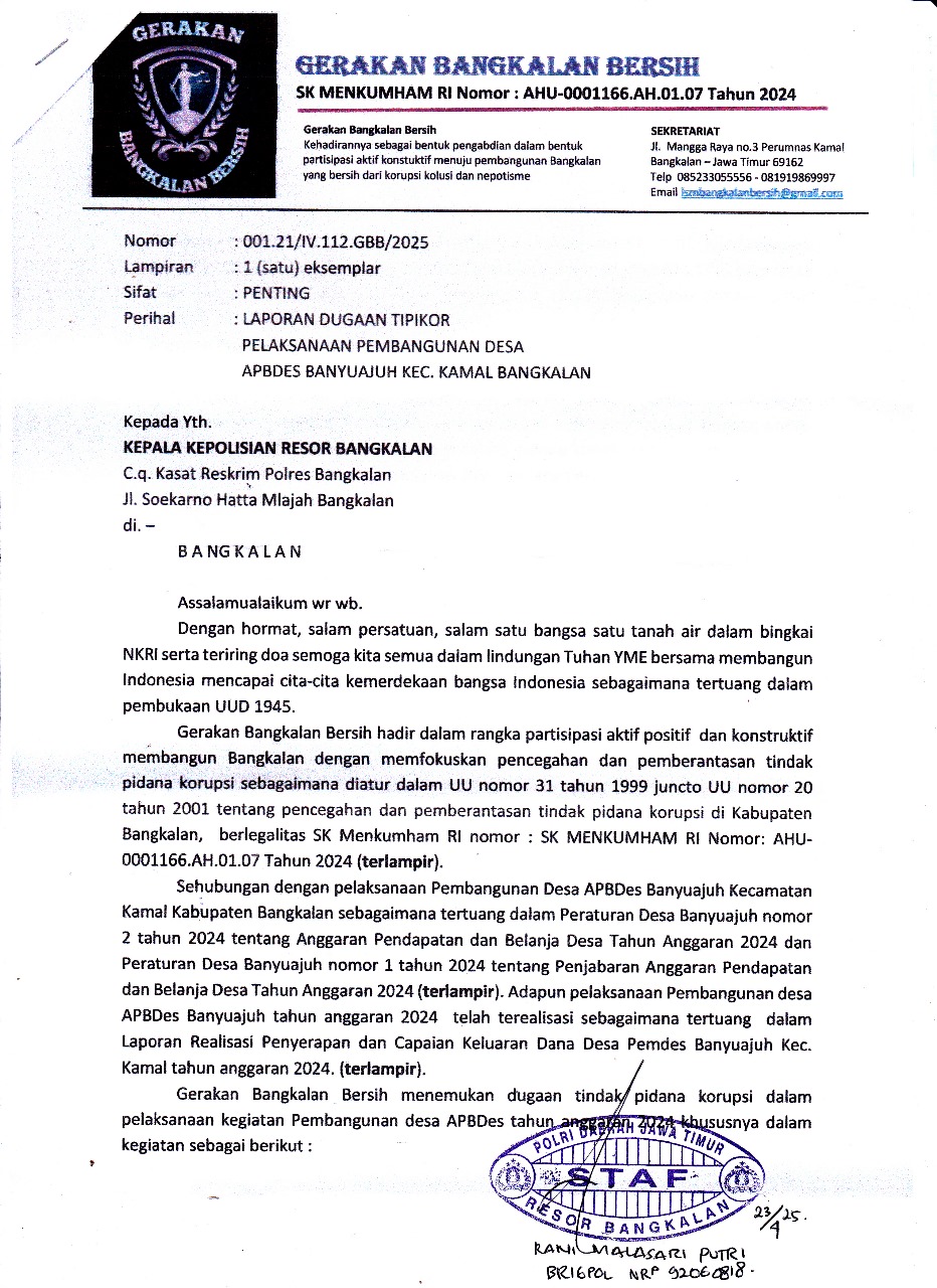 Mengetahui, indikasi korupsi penyelewengan dan APBDes tahun anggaran 2024 yang telah terealisasi sebagaimana tertuang dalam Laporan realisasi penyerapan dan capaian keluaran Dana Desa (DD) Pemerintah Desa Banyuajuh, LSM Gerakan Bangkalan Bersih (GBB) melaporkan ke Polres Bangkalan.