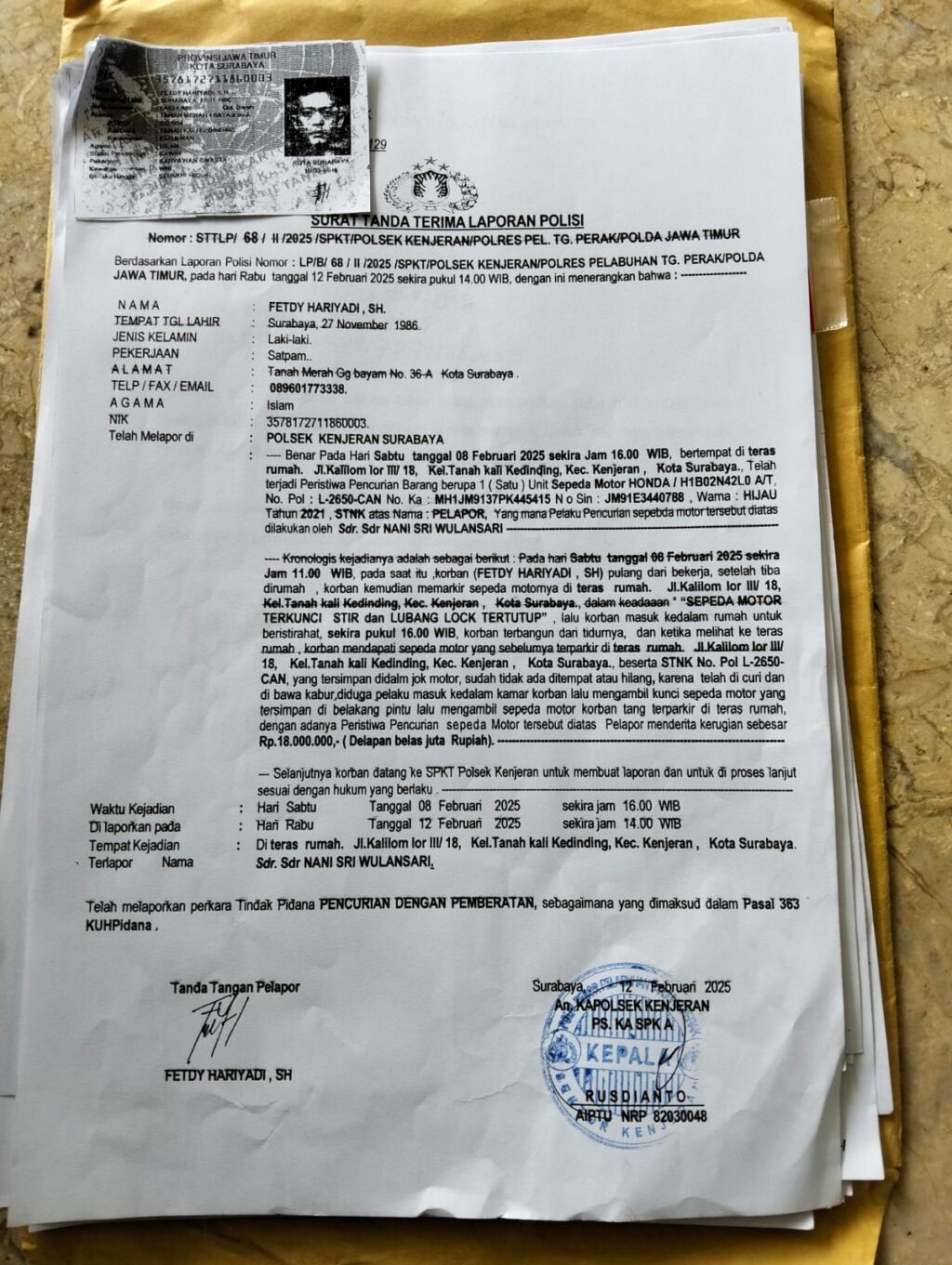 Korban atau pelapor atas nama Fetdy Hariyadi, SH warga Jalan Tanah Merah Bayam No. 36 A, Kelurahan Tanah Kali Kedinding, Kecamatan Kenjeran, Surabaya. Atas kejadian ini, korban menderita kerugian materil sebesar Rp. 18.00.00