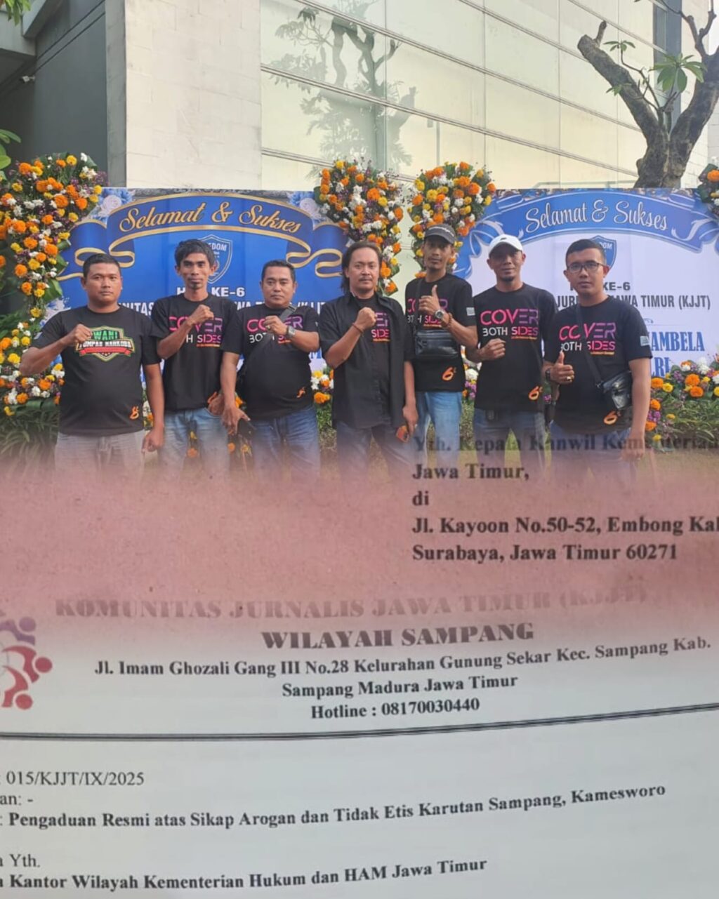 Sampang | Kabarmetronews.com – Komunitas Jurnalis Jawa Timur (KJJT) Kabupaten Sampang resmi melayangkan surat pengaduan kepada Kantor Wilayah (Kanwil) Kementerian Hukum dan HAM Jawa Timur. Surat itu dikirim pada Jumat, 26 September 2026 melalui kantor pos, setelah salah satu anggota KJJT mendapat perlakuan kasar dari Kepala Rumah Tahanan (Karutan) Kelas IIB Sampang (26/9/2025).