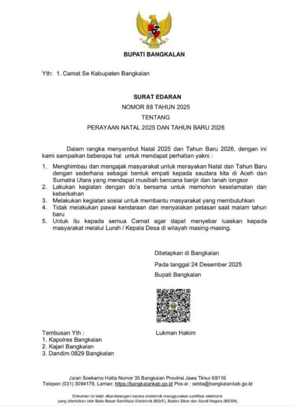 Bupati Bangkalan Lukman Hakim Keluarkan SE Tentang Perayaan Natal 2025 dan Tahun Baru 2026
