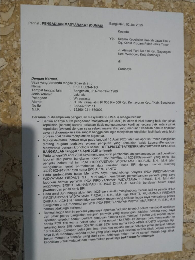 Bangkalan | Kabarmetronews.com – Merasa tidak mendapatkan keadilan dan penanganan perkara yang lamban, korban atas nama Eko Budianto kasus penipuan...